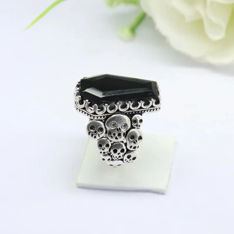 Bague gothique en métal avec pierre noire et crânes pour un look audacieux et unique